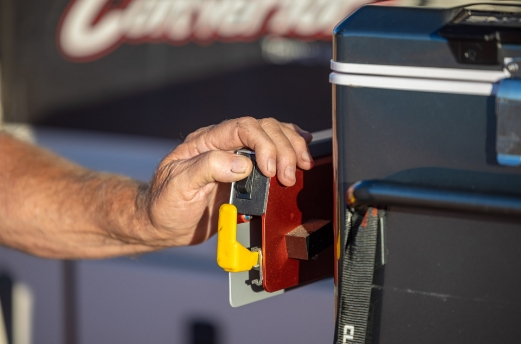 Simply unlock the travel lock mechanism, pull down on the yellow ergonomic slide quick release runner levers and pull the fridge towards you to full extension.