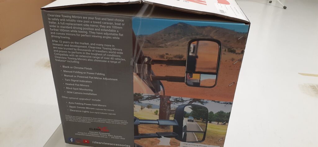 Mirrors are in excellent condition. Purchase April 2021 but not installed until January 2022 when I received my caravan. Need to sell as I have upgraded my tow vehicle. Will be buying Clearview mirrors for my next vehicle.